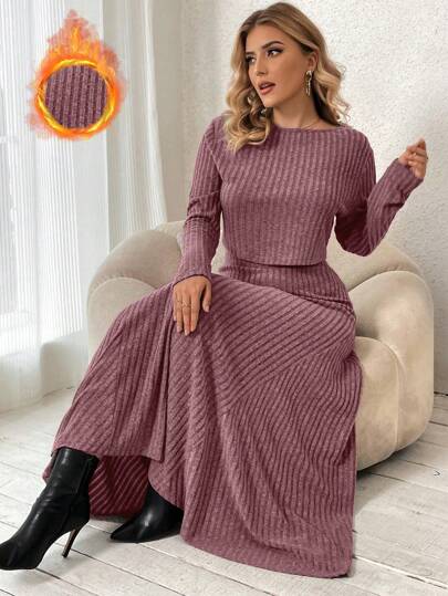 Flirla Plus Size Women 2pcs Set: Long Sleeve Ribbed Knit Top And Skirt - Rusty Rose - View 1