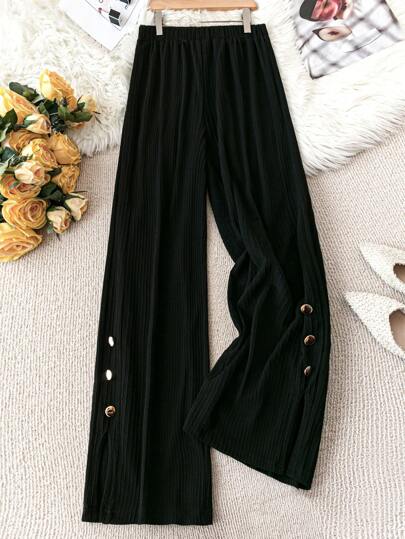 SHEIN LUNE Plus Size Women Casual Button Decor Hem Pants In Black Fall Cloth For Women - Black - View 1