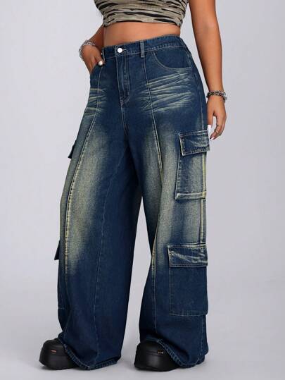 Jeanoix Plus Size Women Casual Denim Pants Baggy With Pockets And Button - Dark Wash - View 1