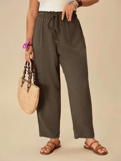 Travachic Plus Size Women Casual Vacation & Daily Commute Solid Color Knotted Waist Loose Straight Leg Pants - Brown - View 1
