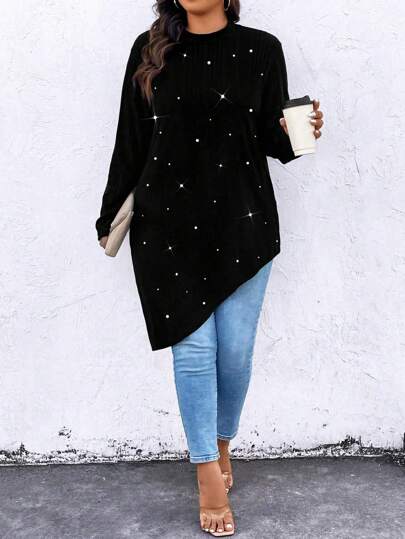 Plus Size Women Crew Neck Long Sleeve Asymmetrical Hem Tee With Faux Pearl Decor, Casual For Autumn For Spring - Black - View 1