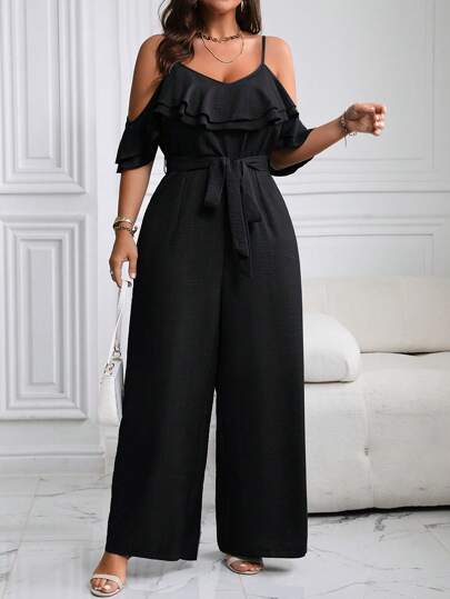Flirla Plus Size Women Double Ruffles Strap Jumpsuit - Black - View 1
