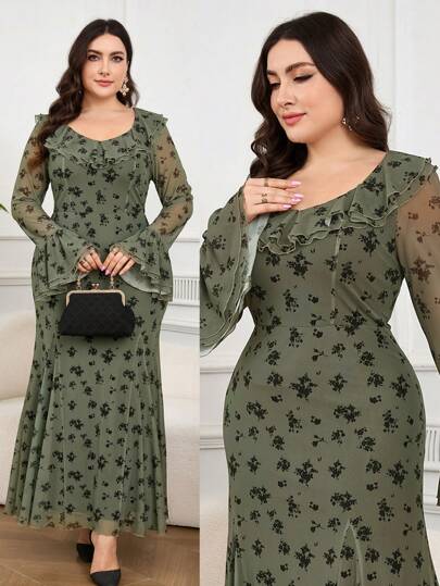 Modelyn Plus Size Women Elegant Floral Flocked Patchwork Ruffle Bell-Sleeve Dress - Beige - View 1
