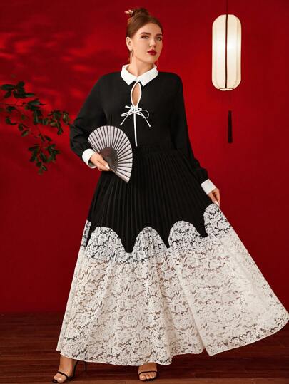 SHEIN Clasi Plus Size Women Lace Patchwork Pleated Skirt, Women's Clothing Stress Relief, Evening Long Gown, Elegant Fashion Women Fall Cloth For Women - Multicolor - View 1