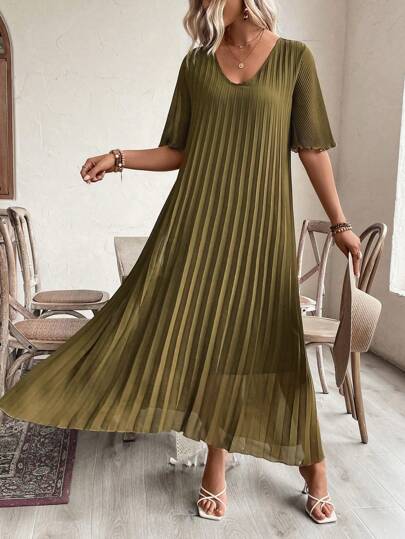 SHEIN LUNE Plus Size Women Pleated Ruffle Sleeve Dress - Army Green - View 1