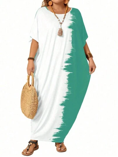 SHEIN LUNE Plus Size Women Round Neck Short Sleeve Color Block Dress - Lime Green - View 1