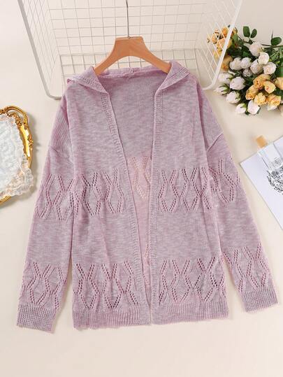 Plus Size Women Solid Color Dropped Shoulder Long Sleeve Hollow Hooded Thin Cardigan - Mauve Purple - View 1