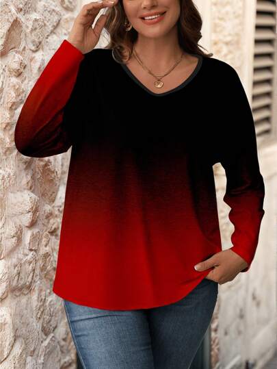 SHEIN LUNE Plus Size Women V-Neck Ombre Color Casual Long Sleeve T-Shirt, Basic Top Suitable For Spring And Autumn - Multicolor - View 1
