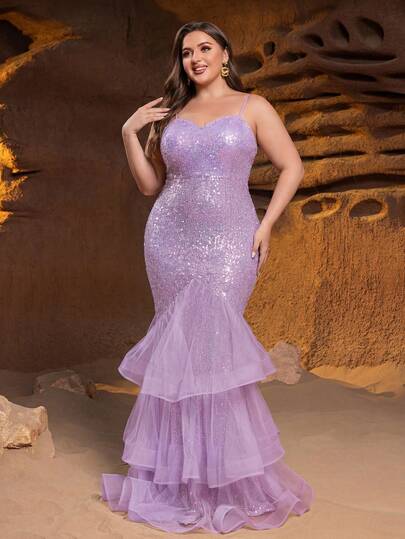 Plus Size Women's Heart Neck Strap Maxi Party Dress, Layered Fluffy Hem Decor, Bodycon Silhouette Highlighting Curves, Suitable For New Year, Valentine's Day, Formal Party, Gala, Wedding And Other Occasions - Mauve Purple - View 1