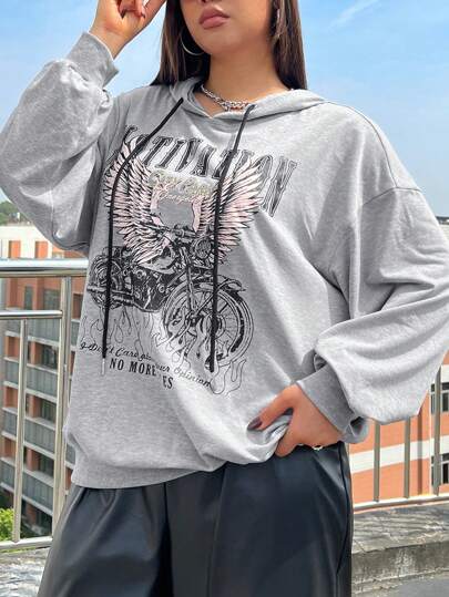 SHEIN EZwear Plus Slogan Graphic Drop Shoulder Drawstring Hoodie - Grey - View 1