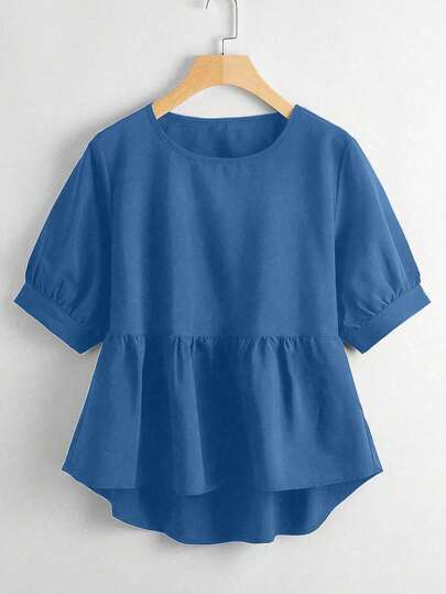 SHEIN Clasi Plus Solid High Low Peplum Blouse - Blue - View 1