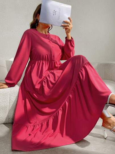 Seusyu Plus Solid Lantern Sleeve Ruffle Hem Arabian Dress - Hot Pink - View 1