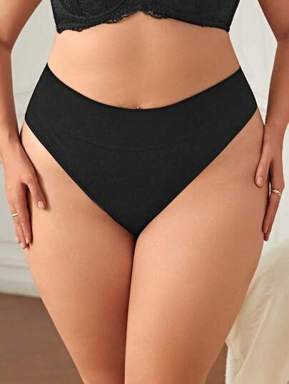 Plus Size Black Plain High Waisted Panties For Women Comfortable Medium Stretch Fabric - Black - View 1