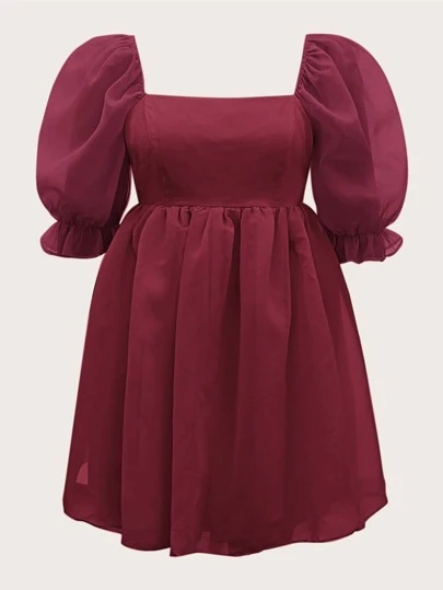 SHEIN MOD Plus Square Neck Puff Sleeve Dress - Burgundy - View 1