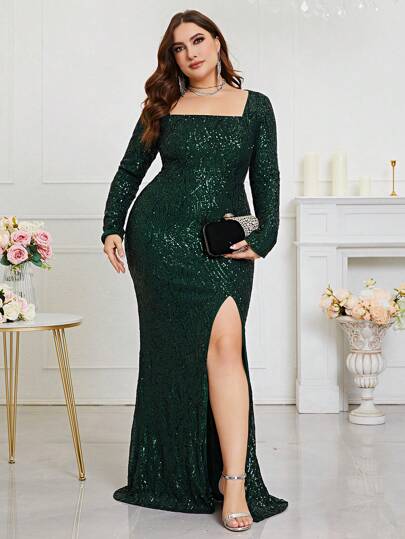 Plus Square Neck Split Thigh Sequin Formal Dress, Elegant Long Sleeve Prom Evening Wedding Guest Gown, For Graduation, Dinner - Green - View 1