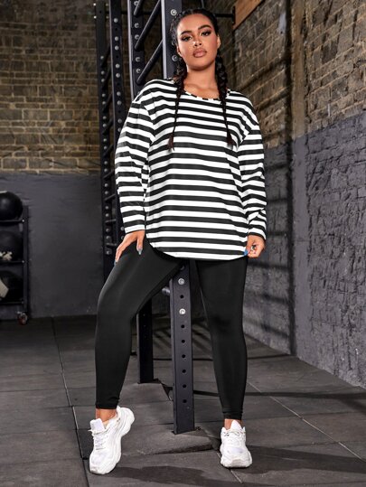 Yoga Trendy Plus Striped Drop Shoulder Sports Tee & Leggings - Black and White - View 1