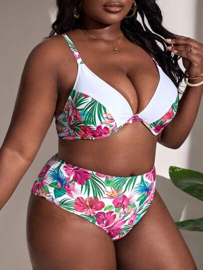 SHEIN Slayr Plus Size Tropical Print Underwire Bikini Set Summer Beach - Multicolor - View 1