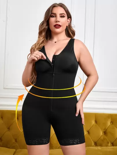 Plus Zip Front Shapewear Unitard Romper - Black - View 1