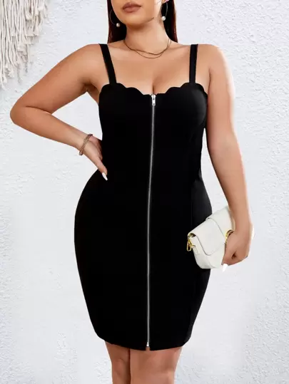 Celure Plus Zip Up Scallop Trim Cami Bodycon Dress - Black - View 1