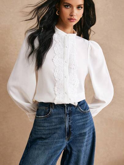 Poéselle Contrast Guipure Lace Button Front Shirt - White - View 1