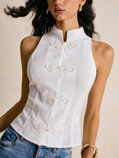 Poéselle Women's Chinese Style Stand Collar Sleeveless Top With Button Design,Button Up Shirt Women,Long Sleeve Shirt,Business Casual Woman,Office Outfits For Women,Old Money Style Women,Classy Outfits For Women, Fall Clothes For Women,Winter Clothes For Women - White - View 5