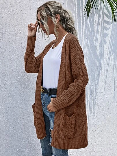 Pocket Patched Cable Knit Cardigan - Brown - View 1