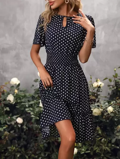 SHEIN Clasi Polka Dot Print Keyhole Neckline Ruffle Hem Dress - Navy Blue - View 1