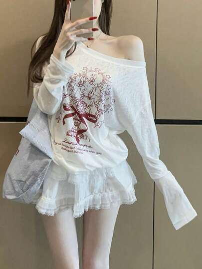 Printed Asymmetric Shoulder Long Sleeve T-Shirt Women's Summer Loose Sunscreen Shrug Shirt, Stylish & Versatile Lightweight Top - White - View 1