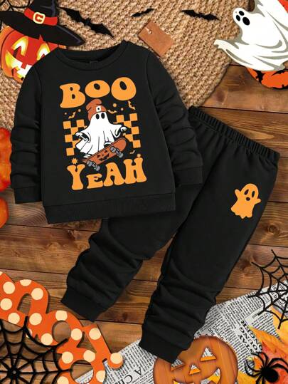 SHEIN Baby Boy Knitted Soft Crew Neck Casual Outfit, Thickened Halloween Print Sweatshirt & Pants Fall Set, Suitable For Autumn And Winter - Black - View 1