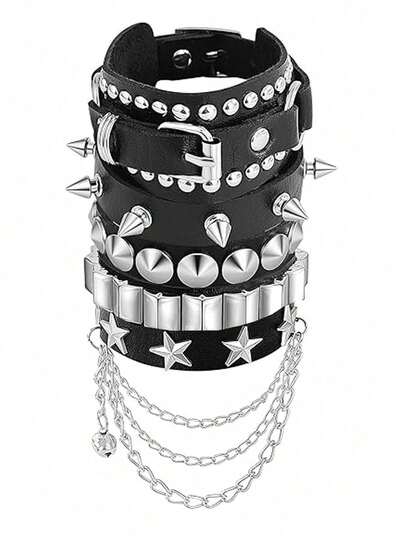 Punk Style Rivet Bracelet - Adjustable Leather Spiked Wristband Suitable For Men & Women - 80s Gothic Punk Accessory - Black - View 1