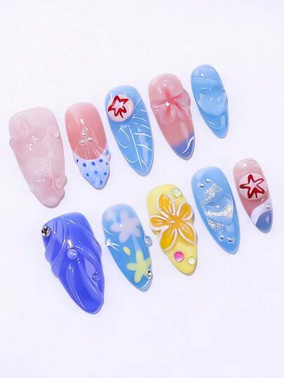 ROMWE Anime 10 Cute Simple Flowers, Love Stars, Fake Nail Pads And A Piece Of Double-Sided Tape. - Blue - View 1