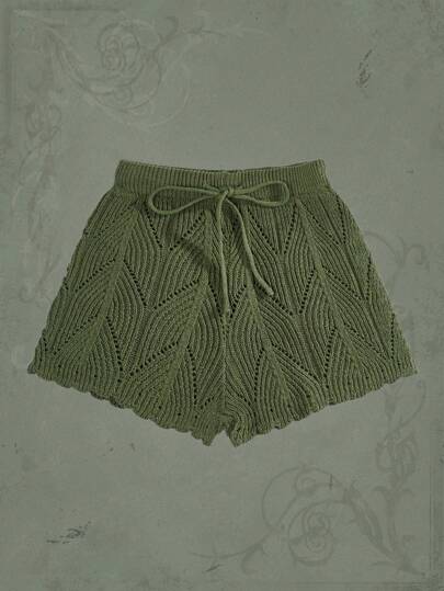 ROMWE Fairycore Elastic Knitted Sweater Shorts With Mori Style And Lace Trim, Plus Size - Dark Green - View 1