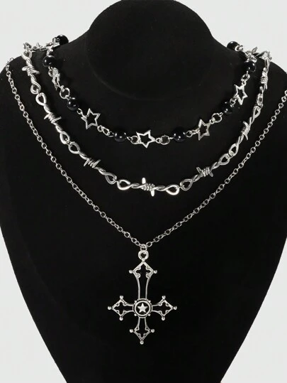 ROMWE Goth 3pcs Fashion Iron Alloy Cross & Star Decor Necklace For Women For Daily Decoration - Multicolor - View 1
