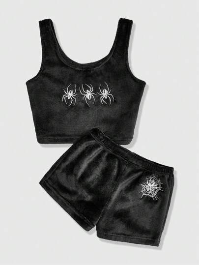 ROMWE Goth Women'S Loungewear Set Spider Embroidery Plush - Black - View 1