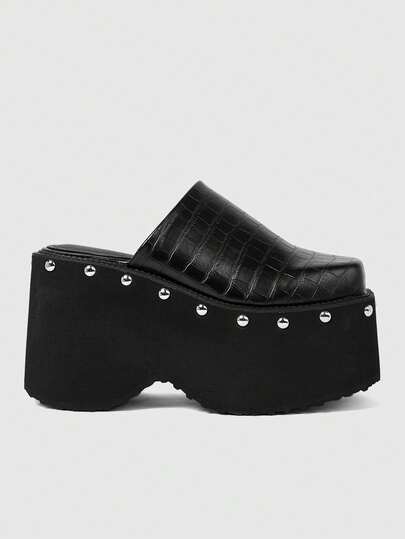 ROMWE Grunge Punk Women's Black Crocodile Embossed Studded Square Toe Platform Sandals - Black - View 1