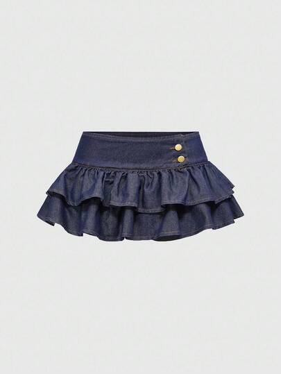 ROMWE Grunge Punk Y2K Retro Low Waist Sexy Double Ruffle Hem Mini Denim Skirt, Blue - Dark Wash - View 1