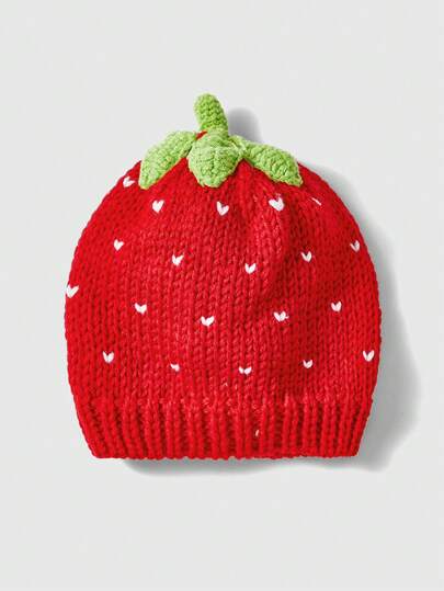 ROMWE Kawaii 1pc Adorable Red Strawberry Design Knitted Beanie Hat For Women, Handmade Crochet Warm Cap For Autumn & Winter Daily Casual Wear Hat Valentine's Day - Red - View 1