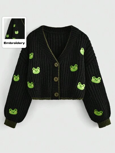 ROMWE Kawaii Frog Embroidery Drop Shoulder Cardigan, School - Multicolor - View 1