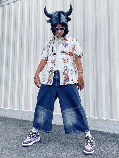 ROMWE MEN Anime Men'S Dragon And Skull Printed Short Sleeve Shirt - White - View 1