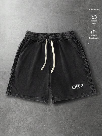 ROMWE MEN Spring/Summer Casual Graphic Men'S Casual Fashion Street Daily Commute Letter Print Drawstring Waist Slant Pocket Washed Loose Shorts, Summer - Black - View 1