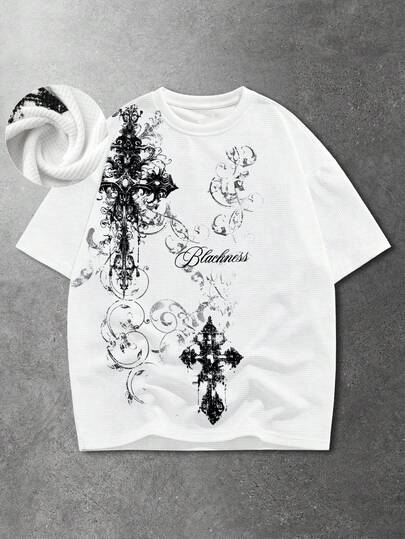 ROMWE MEN Men's Casual Letter & Cross Print Round Neck Short Sleeve T-Shirt, Summer - White - View 1