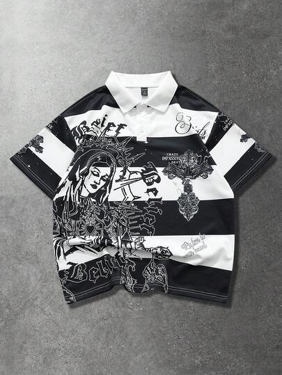 ROMWE MEN Men's Polo Shirt, Casual Spring/Summer Street Style American Short Sleeve Polo Shirt - Black and White - View 1