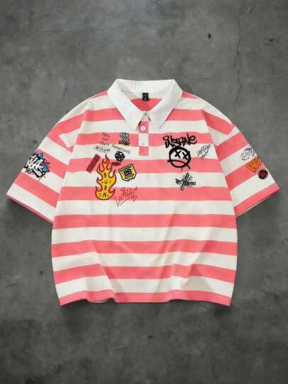 ROMWE MEN Men's Striped Print Loose Short Sleeve Polo Shirt Spring/Summer - Pink - View 1