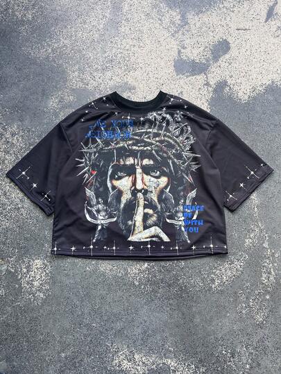 ROMWE MEN Spring/Summer Casual Graphic Men'S Graphic Print Short Sleeve T-Shirt, Loose Fit - Black - View 1