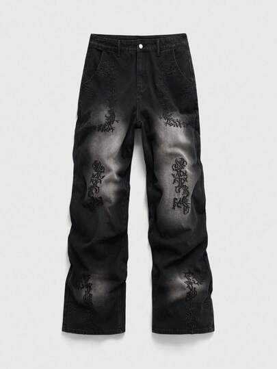 ROMWE MEN Goth Men's Casual Washed Embroidered Denim Jeans - Black - View 1