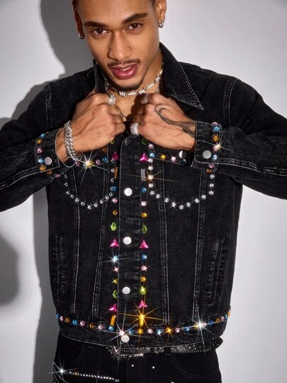 ROMWE MEN Street Life Rhinestone Embellished Casual Loose Personalized Long Sleeve Men Denim Tops, For Fall - Black - View 1