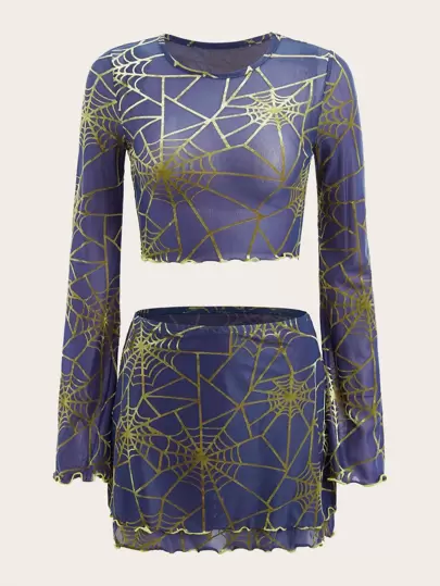 ROMWE PUNK Spider Web Print Lettuce Trim Crop Mesh Top & Bodycon Skirt - Multicolor - View 1