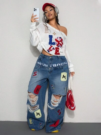 ROMWE Street Life Back To School Plus Size Loose Knit Sweater With UK Flag, Love Jacquard, And Distressed Shoulder Design, Plus Size - White - View 1