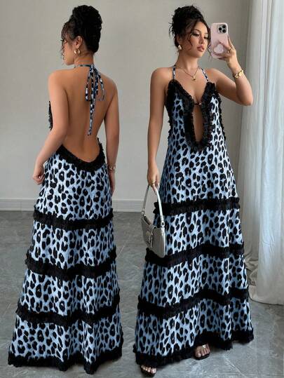 Rafferiza Fashionable Sexy Lace-Up Backless Halter Leopard Print Black Lace Dress - Blue - View 1