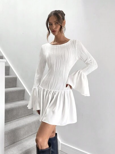 Chiquease Women's Solid Color Round Neck Ruffle Hem Long Sleeve Short Dress - White - View 1